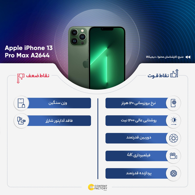 آیفون 13 پرو مکس، آیفون 13 پرو، آیفون 13 و آیفون 13 مینی از محبوبترین گوشیهای هوشمند شرکت اپل شناخته میشوند. آیفون 13 پرو مکس بدون شک به مشخصات فنی قدرتمندتری به نسبت مابقی اعضای این خانواده مجهز شده است. البته، گوشیهای این خانواده از نظر طراحی تفاوت چندانی با نسل قبلی پرچمداران این شرکت ندارند و تنها وجه تمایز در بین این گوشیها به استفاده از ناچ با عرض کمتر خلاصه میشود. آیفون 13 پرو مکس به صفحهنمایشی 6.7 اینچی با رزولوشن 1284×2778 پیکسل مجهز شده است. برای اولین بار در تاریخ گوشیهای هوشمند اپل، صفحهنمایش در نظر گرفته شده برای آیفون 13 پرو مکس توانایی ارائه نرخ بروزرسانی 120 هرتز را دارد که بدون شک میتواند عملکردی روانتر و به مراتب باکیفیتتر نسبت به نسلهای قبلی خود ارائه کند. این صفحهنمایش توانایی ارائه حداکثر روشنایی 1200 نیت (شمع در متر مربع) را دارد که همین امر سبب میشود تا در شرایط نوری متنوع و حتی زیر تابش مستقیم نور خورشید هم وضوح تصویر بسیار خوبی داشته باشد. در قسمت پشتی این گوشی، سه سنسور دوربین به همراه یک سنسور LIDAR با همان طراحی آیفون 12 پرو مکس قرار گرفتهاند. یک سنسور دوربین اصلی با رزولوشن 12 مگاپیکسلی با گشودگی دریچه دیافراگم f/1.5، سنسور دوربین 12 مگاپیکسلی از نوع فوق عریض (Ultra Wide) و سنسور 12 مگاپیکسلی از نوع تله فوتو، دوربین سهگانه آیفون 13 پرو مکس را تشکیل میدهند. پردازنده A15 بایونیک هم اینبار قدرتمندتر از همیشه متشکل از شش هسته این پرچمدار قدرتمند را همراهی میکند. گوشیهای نات اکتیو با قرار گرفتن سیمکارتهای داخلی اکتیو میشوند و برخلاف مدل اکتیو پلمپ کالا باز نشده است. گوشیهای اکتیو برند اپل هم به این شکل هستند که به دلیل محدودیتهای برخی از محصولات اپل برای کشور ایران، در کشورهای همسایه بهصورت رسمی با یک بار قرار گرفتن سیمکارت، اکتیو شده و پلمپ میشوند و باید بدانید که این پروسه هیچ مشکلی در راستای گارانتی کالا بههمراه ندارد. پارتنامبرهای اروپا و ژاپن و امارات تک سیمکارت هستند و پارتنامبرهای مربوط به امارات هم از فیس تایم پشتیبانی نمیکنند. پارتنامبر JA (ژاپن) هم حتی در حالت سایلنت صدای شاتر عکس قطع نمیشود.