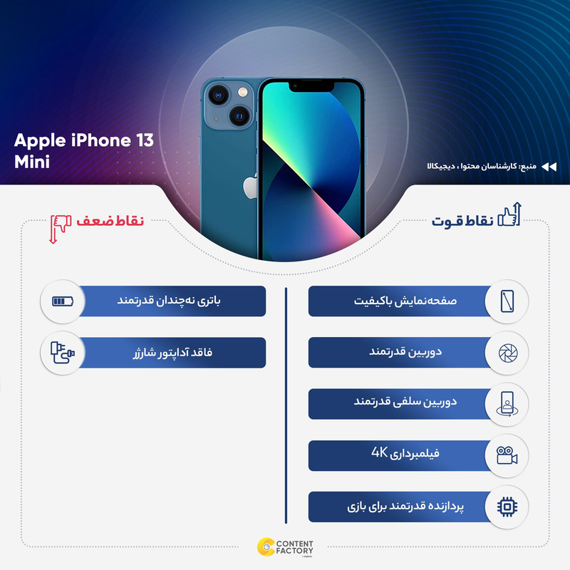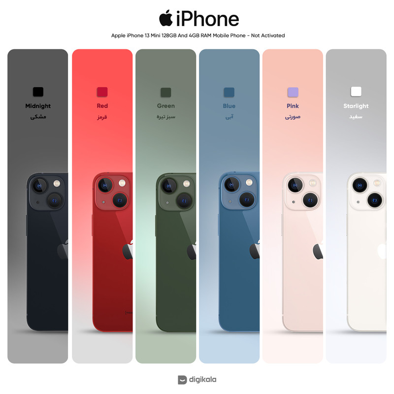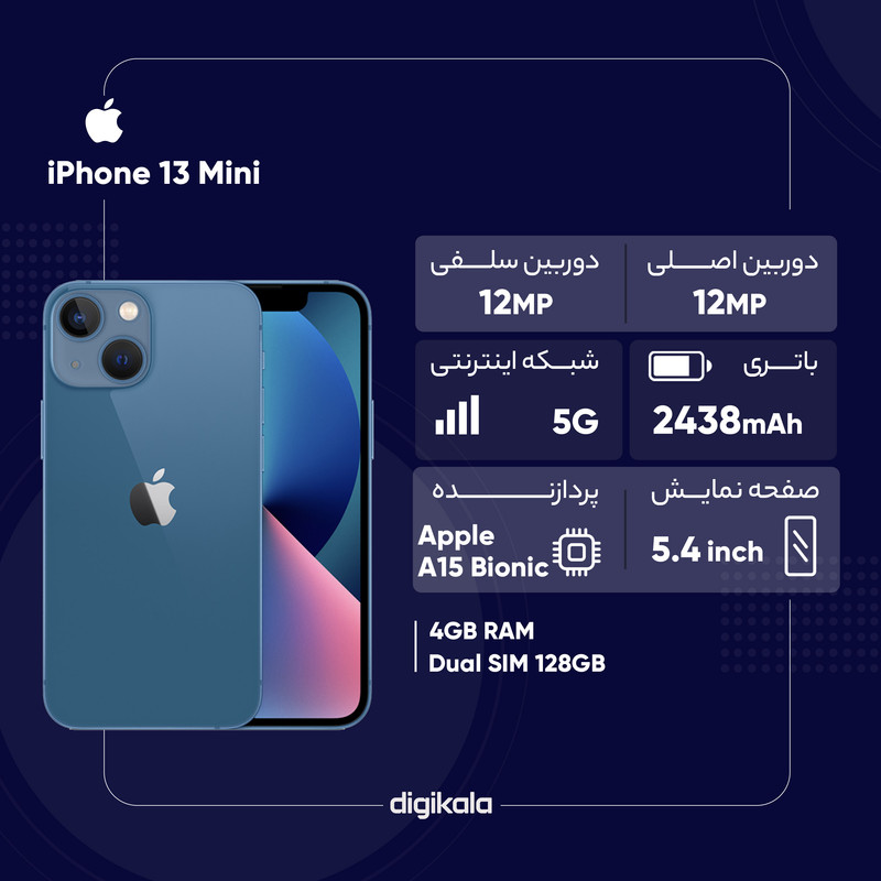 گوشی موبایل «iPhone 13 Mini» پرچمدار جدید شرکت اپل است که با چند ویژگی جدید و دوربین دوگانه روانه بازار شده است. نمایشگر آیفون 13 مینی به پنل Super Retina مجهز شده است تا تصاویر بسیار مطلوبی را به کاربر عرضه کند. این نمایشگر رزولوشن بسیار بالایی دارد؛ بهطوریکه در اندازهی 5.4 اینچیاش، حدود 476 پیکسل را در هر اینچ جا داده است. امکان شارژ بیسیم باتری در این گوشی وجود دارد. روکش سرامیکی صفحهنمایش این گوشی میتواند انقلابی در محافظت بهپا کند. این گوشی ضدآب و ضد گردوخاک است. بدنه زیبا iPhone 13 Mini در مقابل خطوخش مقاومت زیادی دارد؛ پس خیالتان از این بابت که آب و گردوغبار بهراحتی روی آیفون 13 مینی تأثیر نمیگذارد، راحت باشد. قابلیت اتصال به شبکههای 4G و 5G، بلوتوث نسخه 5، نسخه 15 از iOS دیگر ویژگیهای این گوشی هستند. ازنظر سختافزاری هم این گوشی از تراشهی جدید A15 بهره میبرد که دارای 15 میلیارد ترانزیستور است که دارای کنترل گرمای مطلوبی بوده که تا بتواند علاوه بر کارهای معمول، از قابلیتهای جدید واقعیت مجازی که اپل این روزها روی آن تمرکز خاصی دارد، پشتیبانی کند. پردازنده دارای ماژولار جدیدی است که مصرف باتری را بسیار پایینتر آورده است و شما دارای حفظ باتری بالاتری هستید. اپل در این سری از گوشیهای iPhone خود پردازنده گرافیکیای را قرار داده که از سری 12 گوشیهای خود 30 درصد سریعتر است و این نویدبخش آن است که شما میتوانید بازیهایی را با گرافیک و MAP سنگین تر و بزرگتر اجرا کنید. گوشیهای نات اکتیو با قرار گرفتن سیمکارتهای داخلی اکتیو میشوند و برخلاف مدل اکتیو پلمپ کالا باز نشده است. گوشیهای اکتیو برند اپل هم به این شکل هستند که به دلیل محدودیتهای برخی از محصولات اپل برای کشور ایران، در کشورهای همسایه بهصورت رسمی با یک بار قرار گرفتن سیمکارت، اکتیو شده و پلمپ میشوند و باید بدانید که این پروسه هیچ مشکلی در راستای گارانتی کالا بههمراه ندارد. پارتنامبرهای اروپا و ژاپن و امارات تک سیمکارت هستند و پارتنامبرهای مربوط به امارات هم از فیس تایم پشتیبانی نمیکنند. پارتنامبر JA (ژاپن) هم حتی در حالت سایلنت صدای شاتر عکس قطع نمیشود.
