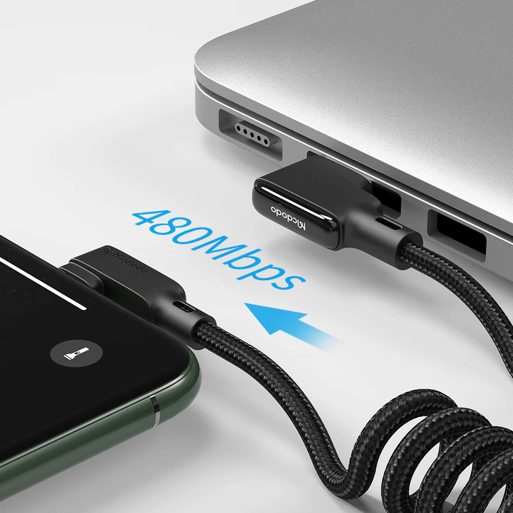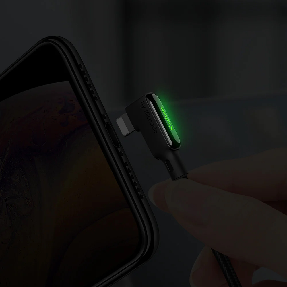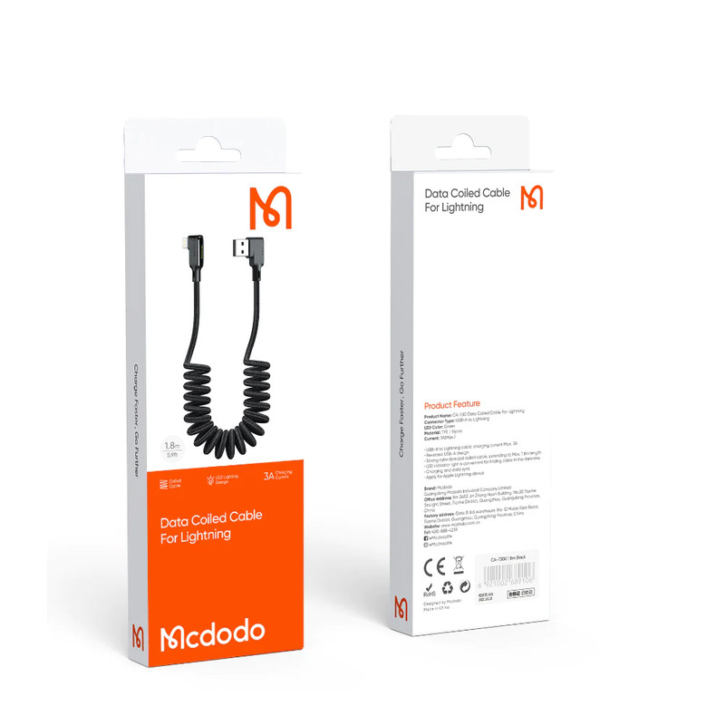 کابل USB به لایتنینگ مک دودو مدل CA-7300 طول 1.8 متر دارای زاویه 90 درجه در سوکت لایتنینگ و سوکت USB است که علاوه بر افزایش طول عمر کابل از دست و پاگیر بودن کابل در زمان شارژ جلوگیری میکند.این کابل فنری بسیار مناسب بازی و فیلم در حالت شارژ و استفاده در خودرو میباشد.کابل لایتنینگ مک دودو دارای کابل کنفی مقاوم و شکیل بافته شده از الیاف TPE میباشد.قابلیت انتقال دیتا و شارژ سریع با انتقال 3 آمپر جریان از خصوصیات این کابل است.چراغ LED تعبیه شده بر روی کابل باعث سهولت پیدا کردن کابل در محیط تاریک شده و جلوه خاصی به کابل می دهد.