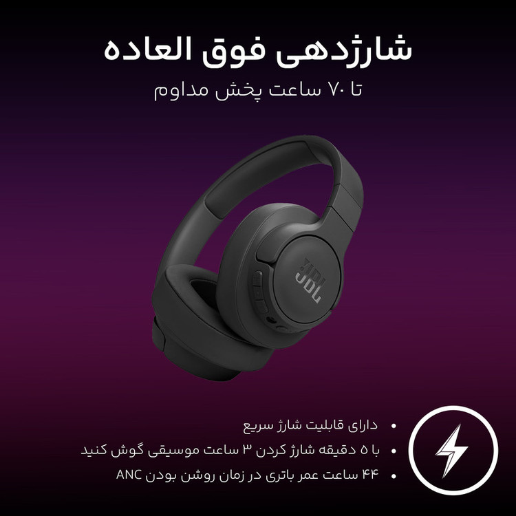 وقتی موسیقی شما پخش میشود، هیچ چیز دیگری مهم نیست. هدفون بیسیم JBL Tune 770NC Adaptive Noise Cancelling این وعده را به شما میدهد که تمام روز و حتی بیشتر، با کنترل نویزهای اضافی، برای شما موسیقی ارائه دهد. این هدفون دارای باتری با عمر استفاده 70 ساعته می باشد که باعث شده تا شما بهراحتی بتوانید در طول یک هفته پرمشغله از آنها استفاده کنید و هنوز هم کافیست جهت استفاده در آخر هفته، JBL Pure Bass Sound را داشته باشید. در صورت نیاز به شارژ سریع، 5 دقیقه کافیست تا پلی تایم 3 ساعته را در اختیار داشته باشید. هدفون JBL Tune 770NC سبک است و قابلیت تاشو دارد و با دو دستگاه بلوتوث بهطور همزمان متصل می شود، بنابراین شما در حین تماشای فیلم روی تبلت، تماسهای خود را از دست نمیدهید. با استفاده از برنامه رایگان JBL Headphones، میتوانید صدا را به سلیقهی خودتان تنظیم کنید و با پیغامهای صوتی به زبان شما، قابلیتهای هدفون را بهراحتی یاد بگیرید. مدیریت تماسها و دستیار صوتی خود را بهسادگی از گوشی خود انجام دهید و با استفاده از ویژگی VoiceAware، هنگام صحبت کردن، خودتان را بشنوید.